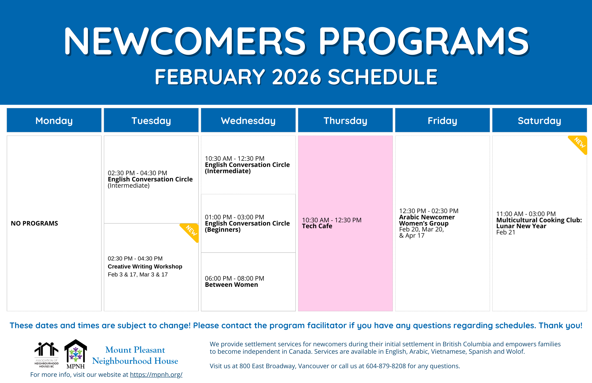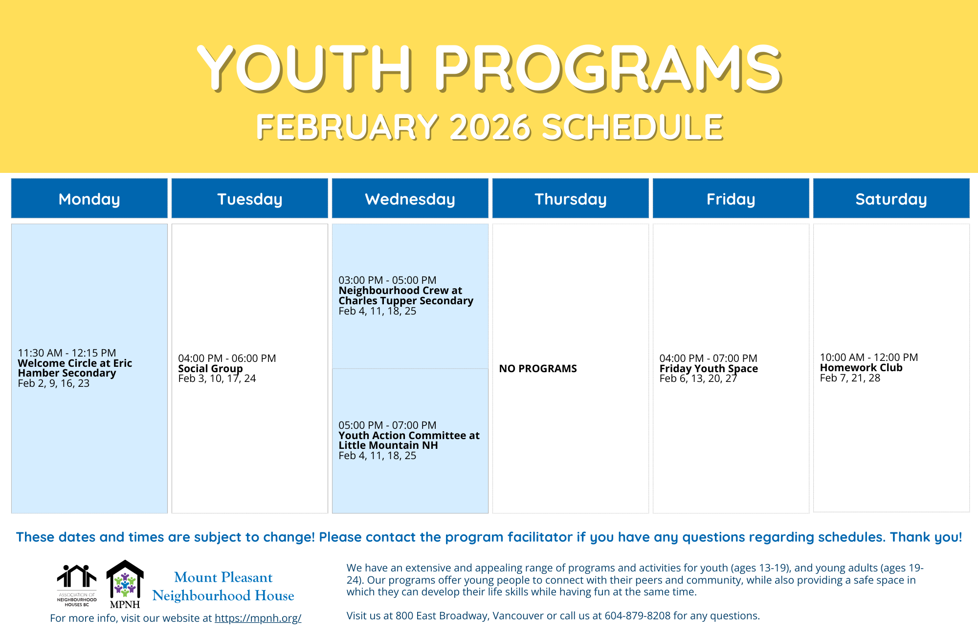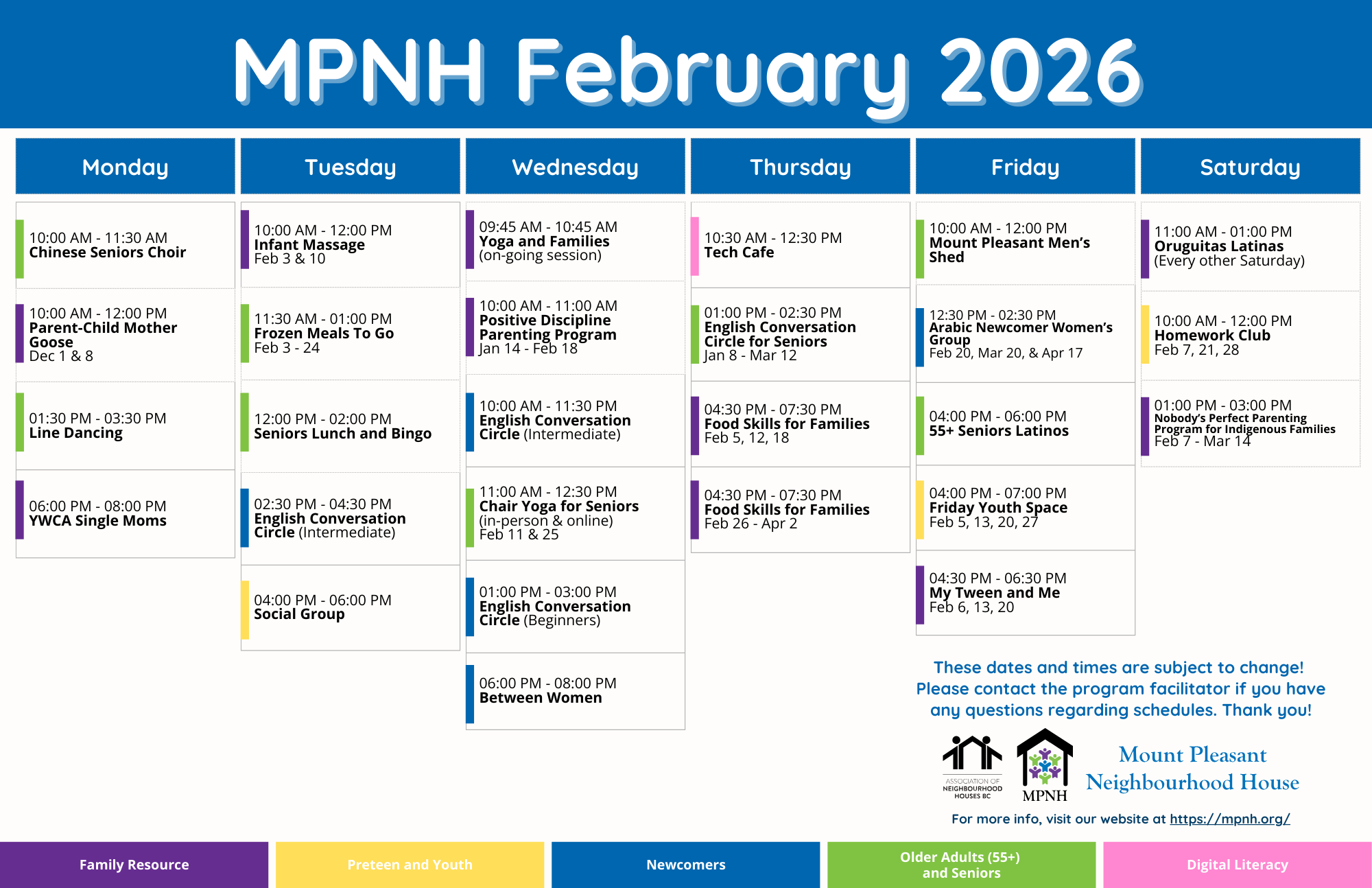 Welcome to Mount Pleasant Neighbourhood House, where we play a leadership role in building a healthy and engaged neighbourhood by connecting people and strengthening their capacity to create change.
